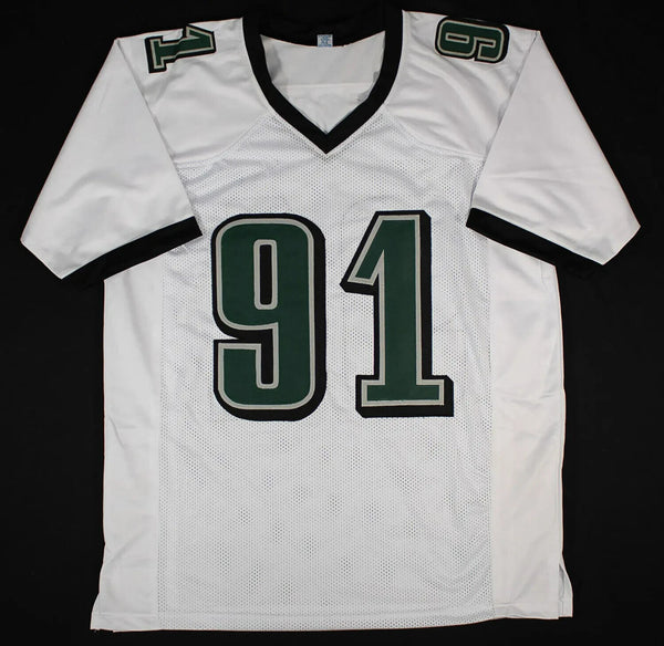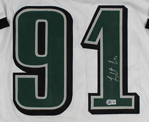 This autographed custom on-field style adult XL jersey has been personally hand-signed by Fletcher Cox of the Philadelphia Eagles. This autograph is certified by Beckett Authentication Services (BAS) Witness Certification. That means that a Beckett representative was present when this item was signed. It comes with the numbered authentication hologram with a QR code card that verifies the authentication on the Beckett website.Custom on-field style jerseys are a more affordable option for autograph seekers. These jerseys do not have any brand name or tags and are made in the Philippines. They feature stitched on names and numbers and are made to look very similar to the on-field jerseys that the players wear. These custom jerseys are very commonly used in the memorabilia industry.