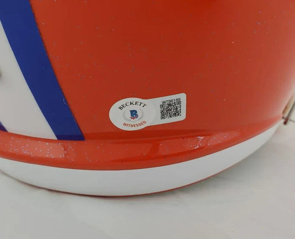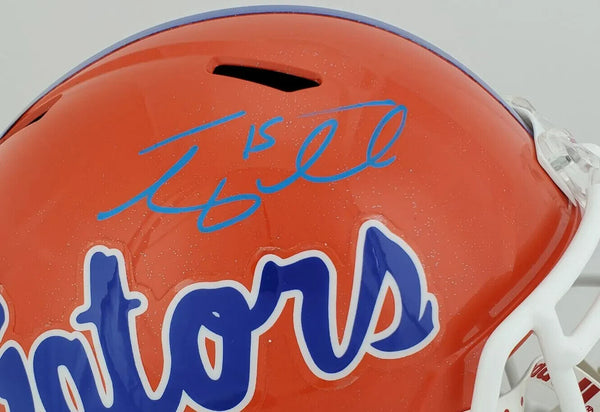 Ridell Florida Gators full-size replica helmet. Hand-signed in Florida Gator Blue by Tim Tebow. The lot / autograph(s) includes an official Beckett Authentication Service QR Code card for authenticity purposes. Authentication: Beckett QR Code card