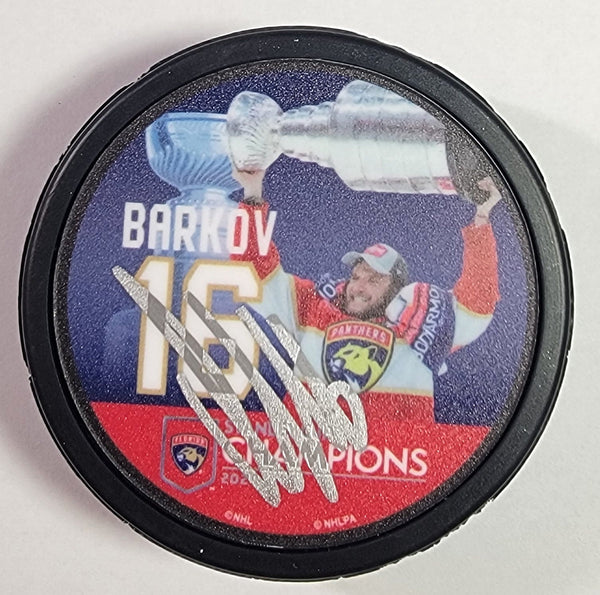 Aleksander Barkov Signed Florida Panthers 2024 Stanley Cup Photo Hockey Puck BAS