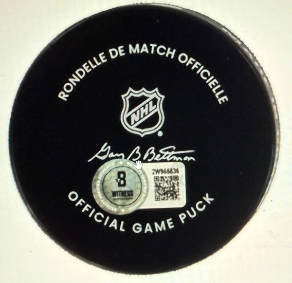 Florida Panthers Official NHL logo game hockey puck has been hand-signed by Aleksander Barkov.The autograph includes an official Beckett Authentication Services serially numbered scannable hologram and QR Code card for authenticity purposes. The signing of this item was witnessed by Beckett.Authentication: Beckett Scannable Hologram with QR Code card