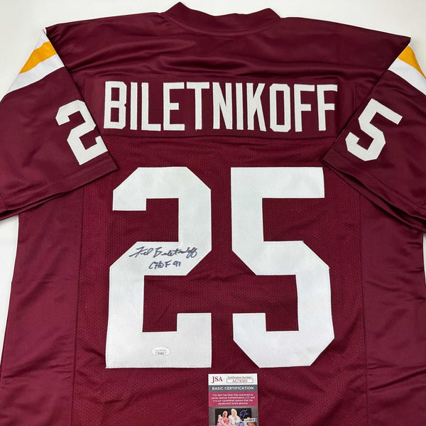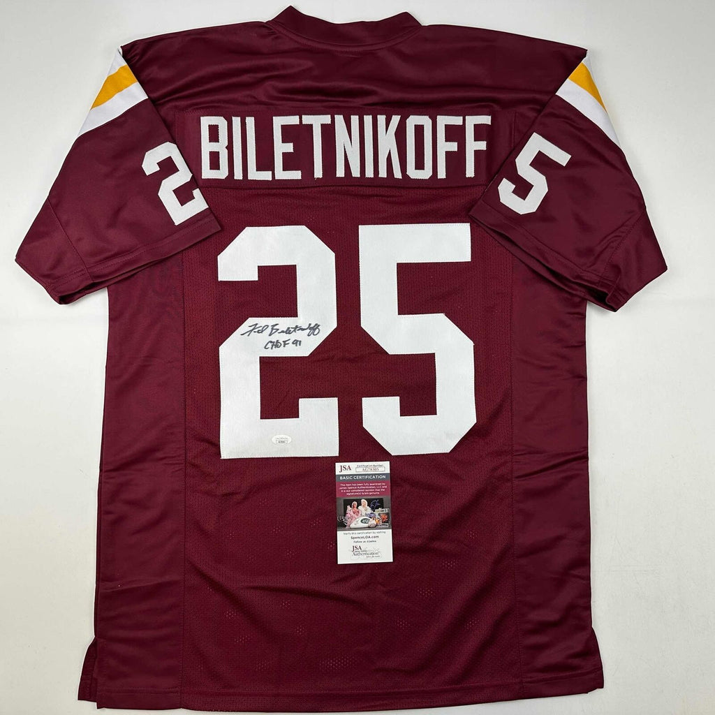 Autographed/Signed Fred Biletnikoff CHOF 91 Florida State FSU Red Jersey JSA COA This is a custom jersey and was not manufactured by or in any manner associated with any professional sports league or manufacturer. This custom jersey carries no professional sports league designation. The item is intended to be an autographed collectible. Reference of team in the title is to allow the purchaser a point of association. The custom jersey displays the name, number and authenticated signature of the player. This item in no way is affiliated with or connected to any professional sports organization. The autograph, as always is guaranteed to be authentic and has been certified as authentic by a third-party, trusted authenticator. Size is XL unless otherwise noted.