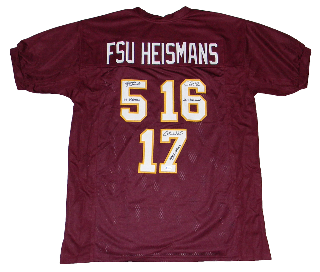 This custom jersey has been hand signed by the 3 Florida State Seminoles Heisman Trophy winners; Charlie Ward, Chris Weinke and Jameis Winston. Each player included his Heisman year inscription. Jersey is size XL and all letters/numbers are sewn-on. This item comes with a certificate of authenticity (COA) from Beckett Authentication Services and was signed in the presence of one of their representatives. You will receive a serial-numbered COA along with a matching serial-numbered sticker on the jersey. The authenticity can be verified online by entering the serial number.Item pictured may not be the exact item you will receive. It will be similar quality, and we guarantee your satisfaction.