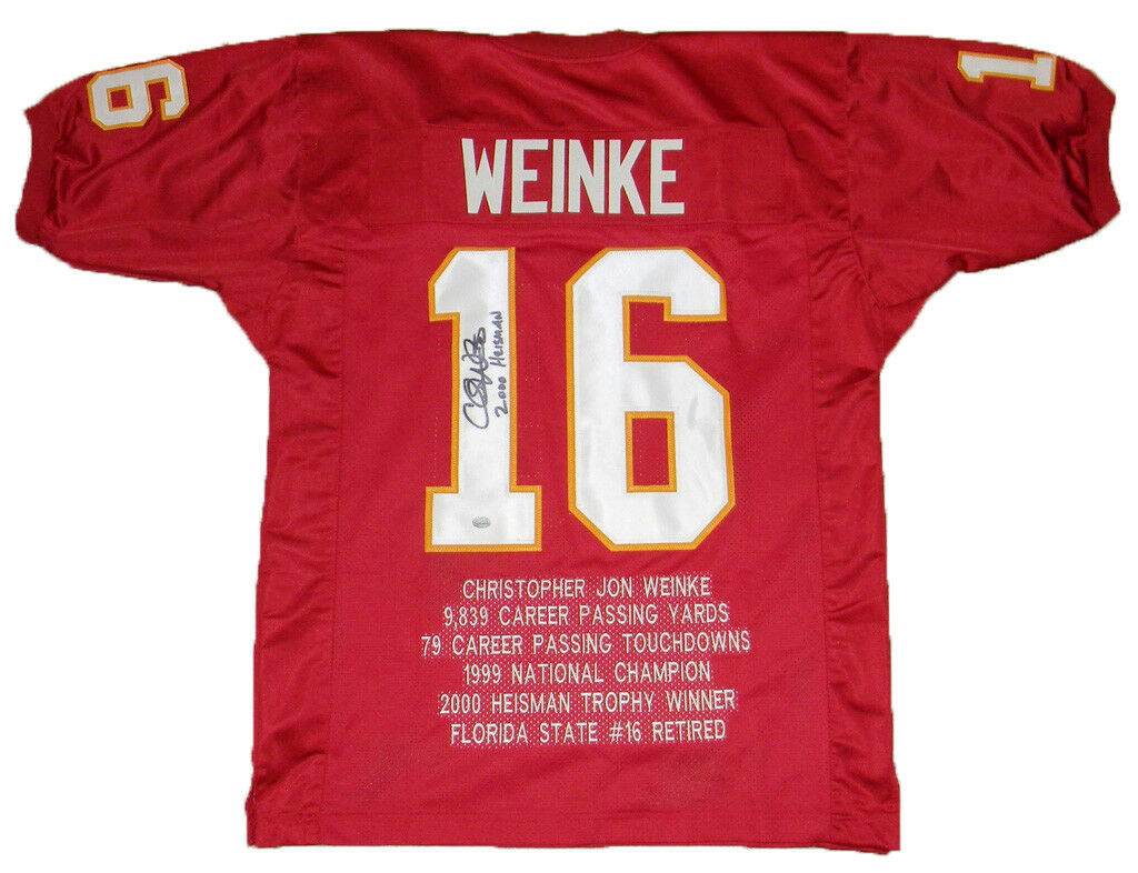 Chris Weinke, former Heisman Trophy winning quarterback for the Florida State Seminoles, has hand signed this custom stat jersey at a private signing. Jersey is size XL and all letters/numbers are sewn-on. This item comes with a certificate of authenticity (COA) from GT Sports Marketing, one of the leaders in the industry. You will receive a paper COA along with an official GTSM hologram on the jersey.Item pictured may not be the exact item you will receive. It will be similar quality, and we guarantee your satisfaction.