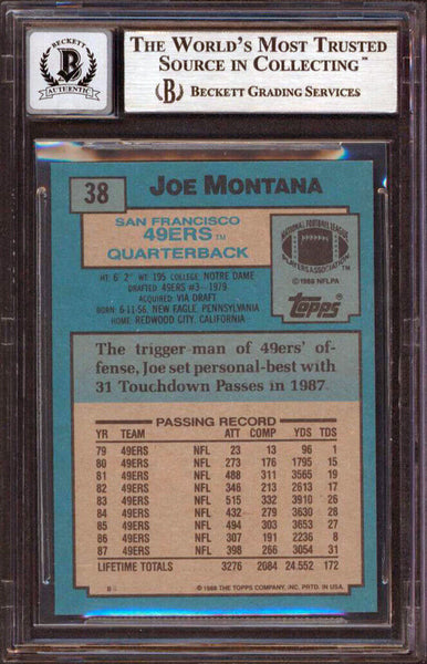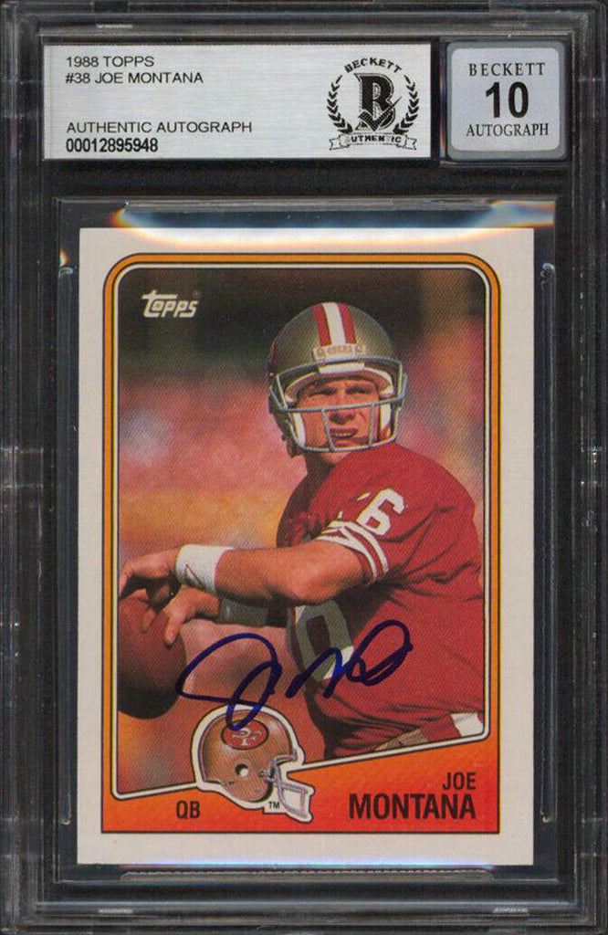This Autographed Auto Graded Gem Mint 10! 1988 Topps #38 Card has been Personally Signed by Joe Montana of the San Francisco 49ers. This item is 100% Authentic, it comes slabbed and authenticated by Beckett Authentication Services. We conducted an autograph signing with where multiples of the same item were signed. While the photographs in this listing are representative of this item, the size, placement and strength of the signature may vary. Each item is hand signed, therefore, each autograph is unique.