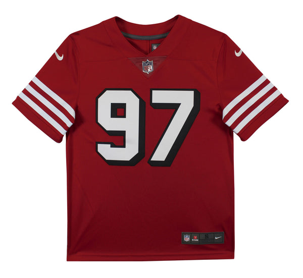 This Autographed Red Nike Elite Jersey has been Personally Signed by Nick Bosa of the San Francisco 49ers. This item is 100% Authentic to include a hologram by Beckett Authentication Services. This item will come with an affixed Beckett Authentication Services (BAS) authentication sticker, which includes a scannable QR code to verify authenticity. Please note that Beckett no longer provides serial-numbered COA cards, and the attached BAS sticker will serve as the complete authentication for this item. This is a BAS Witnessed Protection Program item which means a Beckett Authentication Service representative was present when this item was being signed. The authenticity can be verified on Beckett Authentication Services website. This is a Medium sized Jersey.