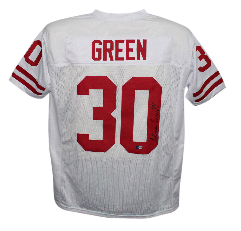 Ahman Green Autographed/Signed College Style White XL Jersey Beckett 37093 The number in the listing title is just an inventory sku for our records and is not the authentication number. The item pictured is a stock photo unless otherwise noted. This is a custom college style white XL jersey with sewn on name and numbers that was personally autographed by Ahman Green. Includes a certificate of authenticity from Beckett Authentication Services (BAS) and Denver Autographs.