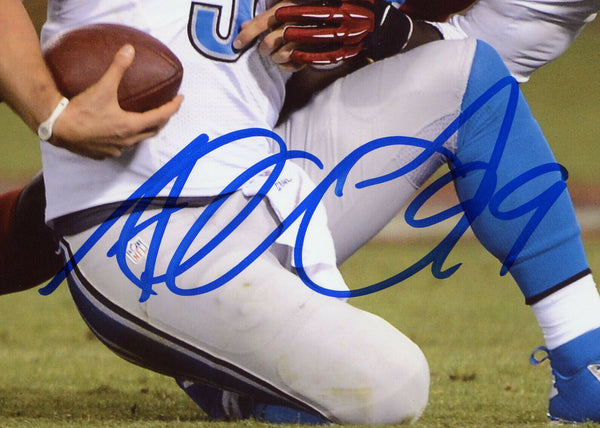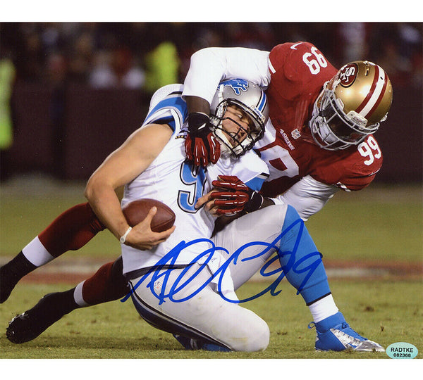A San Francisco 49ers Unframed 8x10 NFL Photo - Sacking Stafford hand signed by Aldon Smith. The item and signature are in excellent condition. Aldon is a Pro Bowler, Defensive Player of the Year & Defensive Rookie of the Year. AUTHENTICATION: The item is accompanied by a Certificate of Authenticity - Serial Numbered Hologram - Picture of Aldon from the signing.