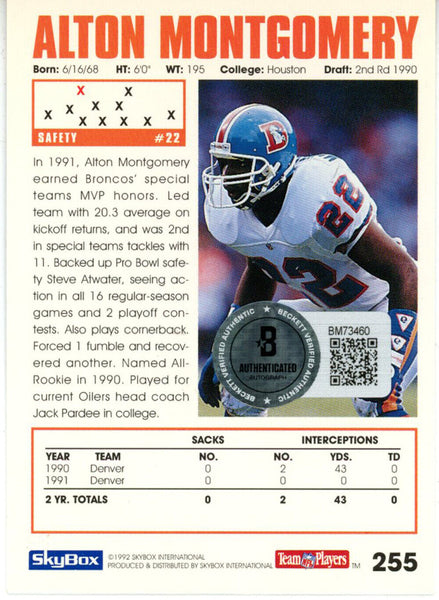 The number in the listing title is just an inventory sku for our records and is not the authentication number. This is the exact item that you will receive so please see pictures for condition. This is a trading card that was personally autographed by Alton Montgomery. Includes a certificate of authenticity from Beckett Authentication Services (BAS) and Denver Autographs.FREE SHIPPING within the USA on orders over $10!