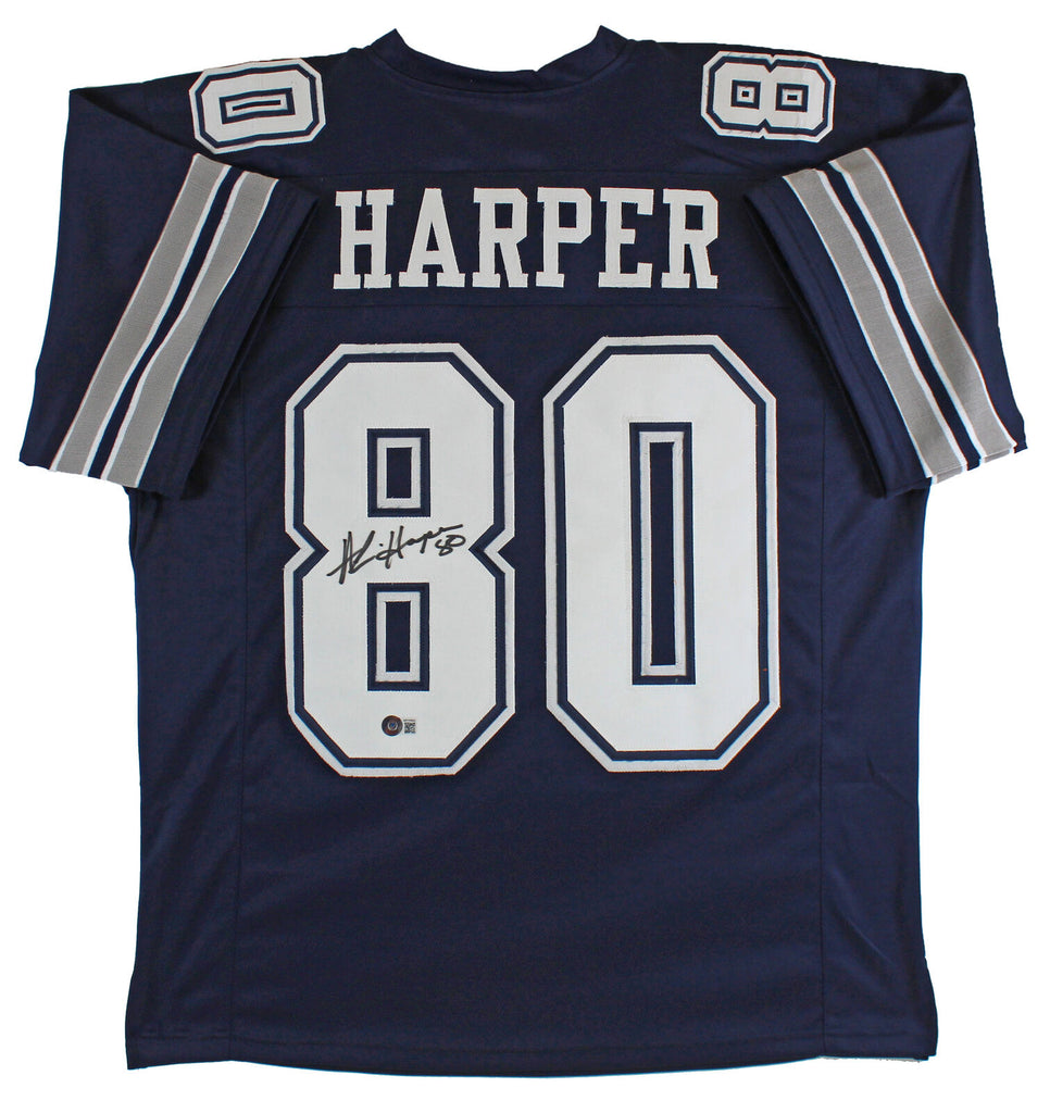 This Autographed Navy Blue Pro Style Jersey has been Personally Signed by Alvin Harper of the Dallas Cowboys. This item is 100% Authentic to include a hologram by Beckett Authentication Services. This item will come with the new Beckett Authentication hologram that has a scannable QR code rather than the traditional COA. If you would like to have a COA, you are welcome to reach out to Beckett for a printed certification once you receive your item. This is a BAS Witnessed Protection Program item which means a Beckett Authentication Service representative was present when this item was being signed. We conducted an autograph signing with Alvin Harper where multiples of the same item were signed. While the photographs are representative of this item, the size, placement and strength of the signature may vary. Each item is hand signed, therefore, each autograph is unique. This item can be verified through BAS Witnessed. This is a X-Large sized, non-branded, custom-stitched Jersey.