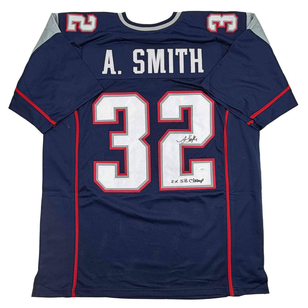 Autographed/Signed Antowain Smith 2x SB Champ New England Blue Jersey JSA COA Jersey has no brand names or logos. This is a custom jersey and was not manufactured by or in any manner associated with any professional sports league or manufacturer. This custom jersey carries no professional sports league designation. The item is intended to be an autographed collectible. The custom jersey displays the name and number of the player. This item in no way is affiliated with or connected to any professional sports organization. Size is XL.