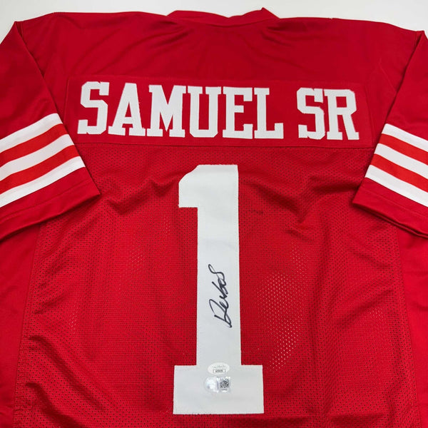 Autographed/Signed Deebo Samuel San Francisco Red Football Jersey JSA COA Jersey has no brand names or logos. This is a custom jersey and was not manufactured by or in any manner associated with any professional sports league or manufacturer. This custom jersey carries no professional sports league designation. The item is intended to be an autographed collectible. The custom jersey displays the name and number of the player. This item in no way is affiliated with or connected to any professional sports organization. Size is XL.