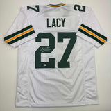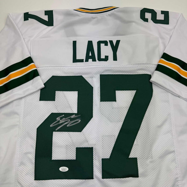 Autographed/Signed Eddie Lacy Green Bay White Football Jersey JSA COA Authentic and comes with third party authentication.