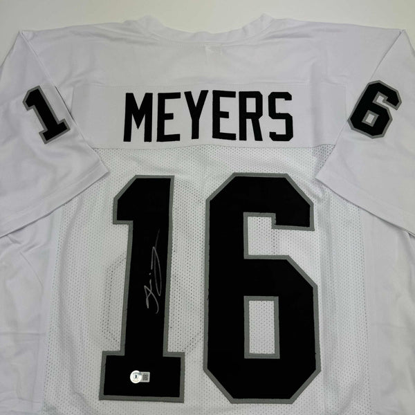 Autographed/Signed Jakobi Meyers Las Vegas Oakland White Jersey Beckett BAS COA Jersey has no brand names or logos. This is a custom jersey and was not manufactured by or in any manner associated with any professional sports league or manufacturer. This custom jersey carries no professional sports league designation. The item is intended to be an autographed collectible. The custom jersey displays the name and number of the player. This item in no way is affiliated with or connected to any professional sports organization. Size is XL.