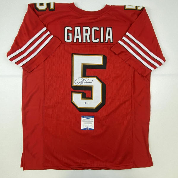 Autographed/Signed JEFF GARCIA San Francisco Red Football Jersey Beckett BAS COA This is a custom jersey and was not manufactured by or in any manner associated with any professional sports league or manufacturer. This custom jersey carries no professional sports league designation. The item is intended to be an autographed collectible. The custom jersey displays the name, number and authenticated signature of the player. This item in no way is affiliated with or connected to any professional sports organization. The autograph, as always is guaranteed to be authentic and has been certified as authentic by a third-party, trusted authenticator. Size is XL unless otherwise noted.