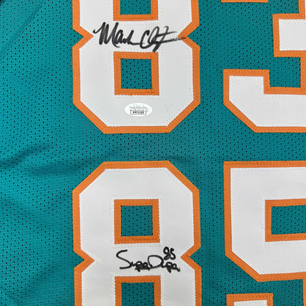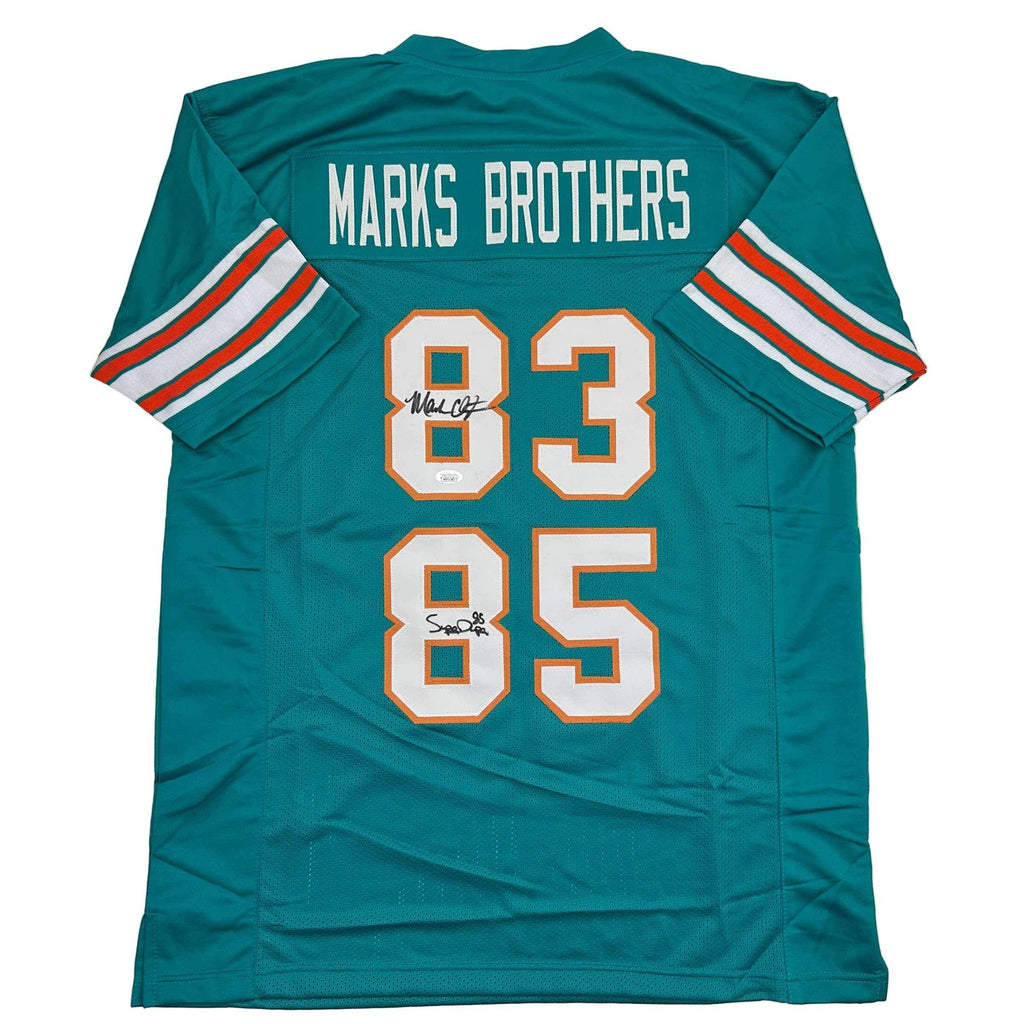 Autographed/Signed Marks Brothers Mark Clayton & Duper Miami Teal Jersey JSA COA Jersey has no brand names or logos. This is a custom jersey and was not manufactured by or in any manner associated with any professional sports league or manufacturer. This custom jersey carries no professional sports league designation. The item is intended to be an autographed collectible. The custom jersey displays the name and number of the player. This item in no way is affiliated with or connected to any professional sports organization. Size is XL.
