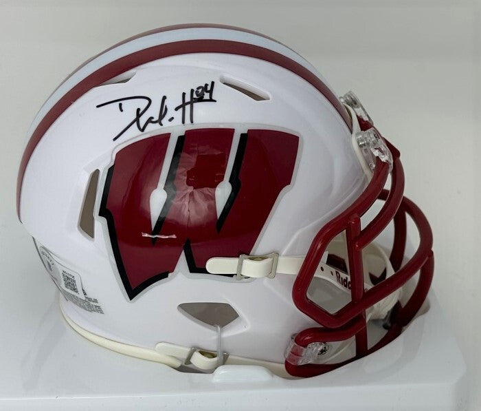 Riddell WI Badgers Speed Mini Helmet hand signed by Pittsburg Steelers Running Back DEREK WATT. The signature is in Black paint pen. This item was signed at a private signing with us and would make a great addition to any Steelers or Badgers collection! This autograph is guaranteed to be 100% authentic and will include a COA hologram from Beckett authentication.