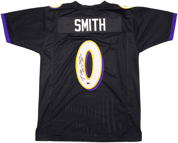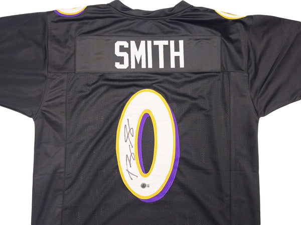 This is a Black Jersey that has been hand signed by Roquan Smith. This is a custom jersey with no name brand. The approximate size is XL. It has nice sewn in name and numbers. This item has been witnessed and certified authentic by Beckett Authentication (BAS) and comes with their tamper-proof witness sticker.