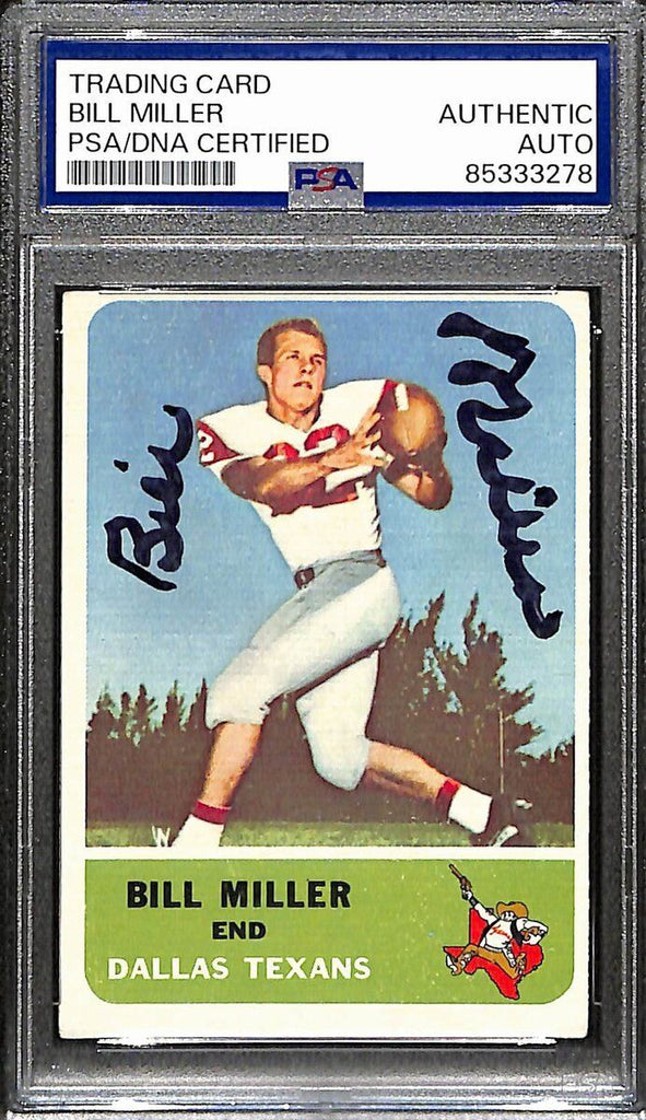 Bill Miller Signed/Autographed 1962 Fleer #28 Dallas Texans. This card is authenticated by PSA/DNA and is encapsulated in their Tamper-proof Plastic Case.