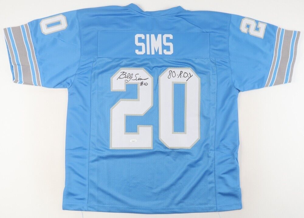 Custom on-filed style jersey with everything sewn on, size XL. Hand-signed and inscribed by Billy Sims.The autograph(s) includes an official James Spence Authentication (JSA) hologram and matching COA for authenticity purposes.Authentication: JSA COA