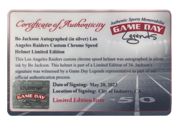 This los angeles raiders authentic riddell chromed speed helmet has been personally hand-signed by bo jackson. this helmet includes all the bells and whistles. it comes with an individually numbered, tamper-evident hologram from beckett authentic as well as super sports center. also included is the gdl certificate of authenticity. to ensure authenticity, the hologram can be reviewed online. this process helps to ensure that the product purchased is authentic and eliminates any possibility of duplication or fraud.this helmet is limited to just 34 and you are bidding on number "34" from the edition.