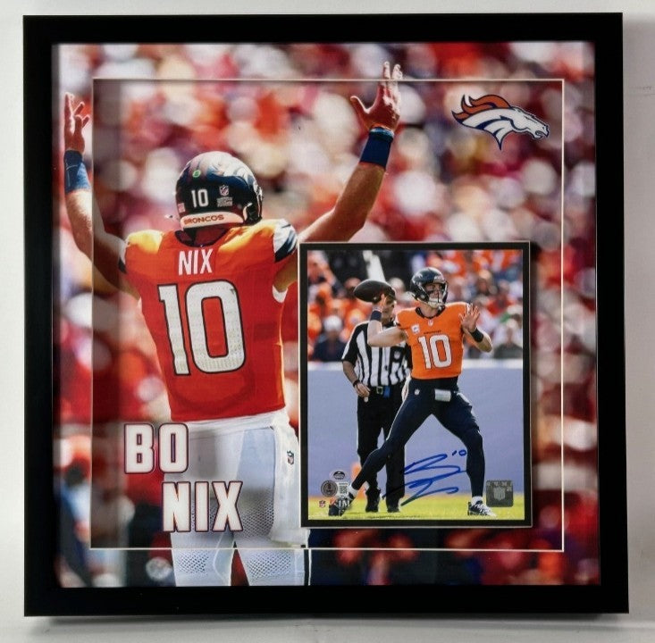 The Future of Broncos Football - Second Year Quarterback Sensation Own a piece of Denver Broncos history with this exceptional Bo Nix autographed 8x10 photo elegantly presented in a deluxe 21.5"x21.5" professional frame. This collectible captures the excitement of the Broncos' promising young quarterback: Authentic Bo Nix signature on premium 8x10 photo Beckett Certificate of Authenticity - guaranteed genuine autograph Deluxe professional framing - premium 21.5"x21.5" display High-quality action photo - showcases Nix in Broncos uniform Professional matting and mounting - museum-quality presentation Protective glass covering - preserves signature and photo This remarkable piece celebrates Bo Nix's journey to the NFL and his role as Denver's quarterback of the future. The former Oregon Duck and Auburn Tiger brings a wealth of college experience and leadership to Mile High, representing hope for Broncos fans eager for championship football. Bo Nix's credentials: 2024 NFL Draft pick, former Oregon standout, Auburn transfer, Pac-12 experience, prolific college passer with over 15,000 career passing yards, and the quarterback Denver believes can lead them back to playoff contention. Perfect for: Denver Broncos fans, rookie card collectors, Oregon Ducks alumni, Auburn Tigers fans, NFL memorabilia enthusiasts, investment collectors seeking emerging talent The sophisticated deluxe framing creates an elegant presentation that highlights this rising star's signature beautifully. With Beckett's trusted authentication, you're guaranteed a genuine piece from a quarterback who could define the next era of Broncos football. Secure this collectible from Denver's franchise quarterback - perfect for fans who want to own memorabilia from the beginning of what could be a legendary NFL career.