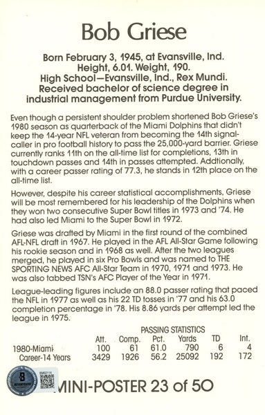 Bob Griese Signed Miami Dolphins Mini Poster 23/50 Beckett 46118