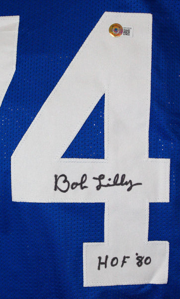 Bob Lilly Autographed Blue Pro Style Jersey w/HOF-Beckett W Hologram *Black THIS IS NOT AN NFL JERSEY. THIS HAS NO TAGS, NO LOGOS, NO EMBLEMS. This is a hand autographed Jersey of Bob Lilly and inscribed with HOF 80. This is Custom Made (non name brand) Authentic Style (stitched letters and numbers). This item has a Beckett Witnessed Authentication, which comes with a numbered hologram and a QR code for verification. You can view this item on the Beckett Authentication website, it shows when and where the item was signed. It was signed either at a public autograph appearance or a private signing. This is a stock photo of the item. Although you may not receive this exact item, the item you receive is virtually identical and brand new in great shape. Jersey size is XL.