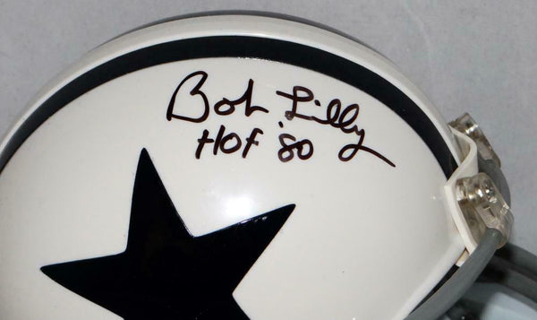 This is a hand autographed mini helmet of Bob Lilly of The Dallas Cowboys. This is a Riddell football mini helmet. This item has a James Spence Witness Authentication, which comes with a JSA numbered sticker and a matching JSA COA. You can view this item on the SpenceLOA website and it shows when and where the item was signed. It was signed either at a public autograph appearance or a Private Signing. This is a stock photo of the item. Although you may not receive this exact item, the item you receive is virtually identical and brand new in great shape. This is a hand autographed mini helmet of Bob Lilly of The Dallas Cowboys. This is a Riddell football mini helmet. This item has a James Spence Witness Authentication, which comes with a JSA numbered sticker and a matching JSA COA. You can view this item on the SpenceLOA website and it shows when and where the item was signed. It was signed either at a public autograph appearance or a Private Signing. This is a stock photo of the item. Although you may not receive this exact item, the item you receive is virtually identical and brand new in great shape.