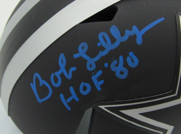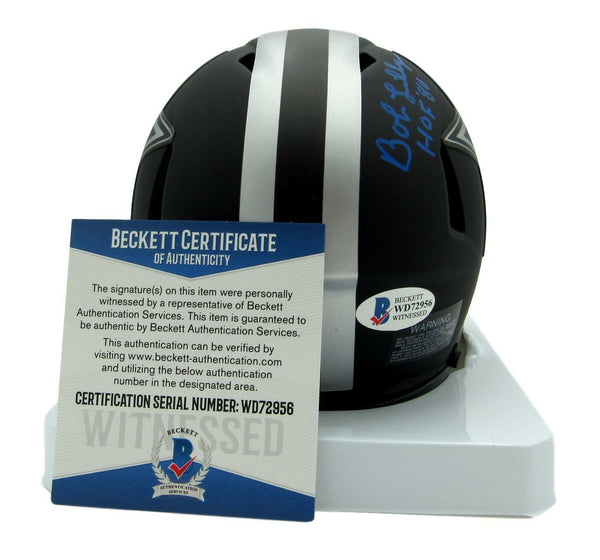 Bob lilly signed dallas cowboys eclipse mini football helmet. this helmet is authenticated by bas/beckett and includes their tamper-proof sticker and certificate of authenticity.