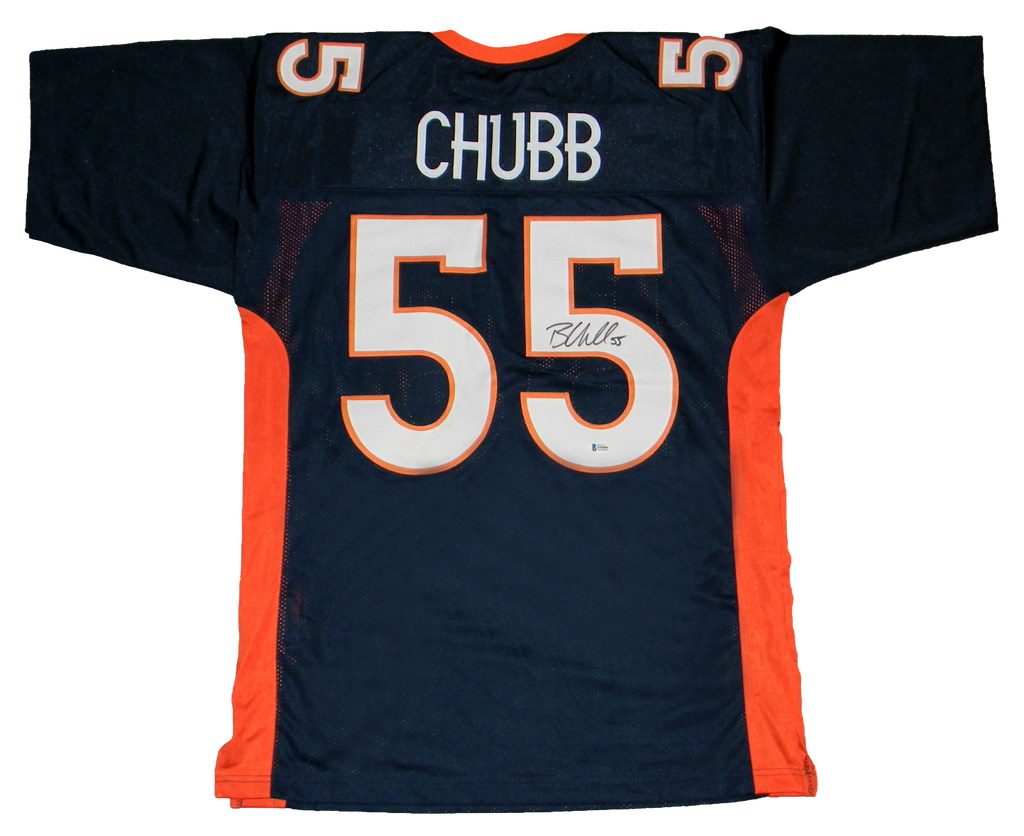 Bradley Chubb, star linebacker for the Denver Broncos, has hand signed this navy custom jersey at a private signing. Jersey is size XL and all letters/numbers are sewn-on. This item comes with a certificate of authenticity (COA) from Beckett Authentication Services and was signed in the presence of one of their representatives. You will receive a serial-numbered COA along with a matching serial-numbered sticker on the jersey. The authenticity can be verified online by entering the serial number.Item pictured may not be the exact item you will receive. It will be similar quality, and we guarantee your satisfaction.