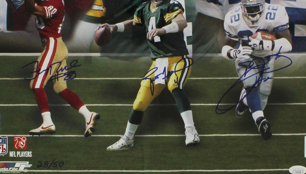 A Framed 20x24 Kings of the NFL Photo hand signed by Brett Favre, Emmitt Smith & Jerry Rice. The item and signature are in excellent condition. The frame measures approximately 28"x32". This is a limited edition of 50. Buyer will receive a random number from the edition. AUTHENTICATION: The item is accompanied by a JSA Ceratificate of Authenticity - JSA Serial Numbered and Databased Hologram.
