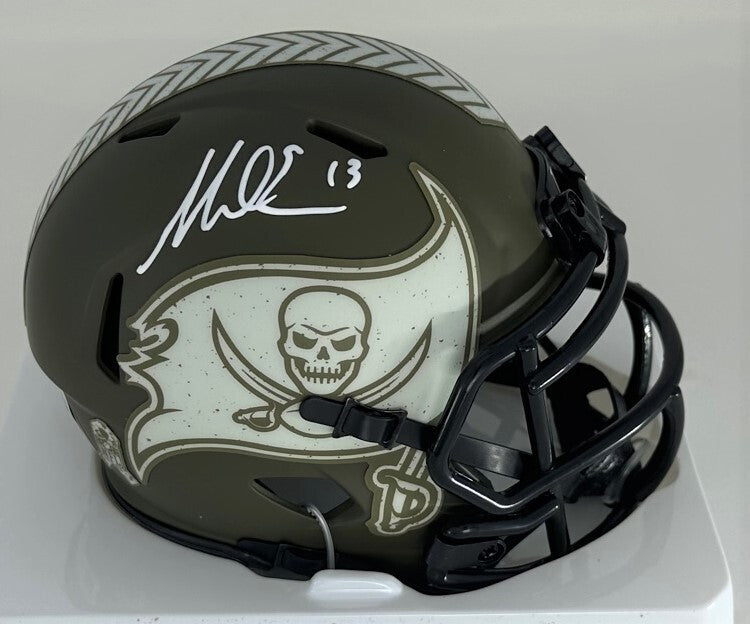 Riddell SALUTE TO SERVICE Speed Mini Helmet hand signed by Tampa Bay Buccaneers Receiver MIKE EVANS. The signature is in White paint pen. This item was signed at a private signing and would make a great addition to any Bucs collection! This item is guaranteed to be 100% authentic and will include a COA hologram from Beckett Authentication.