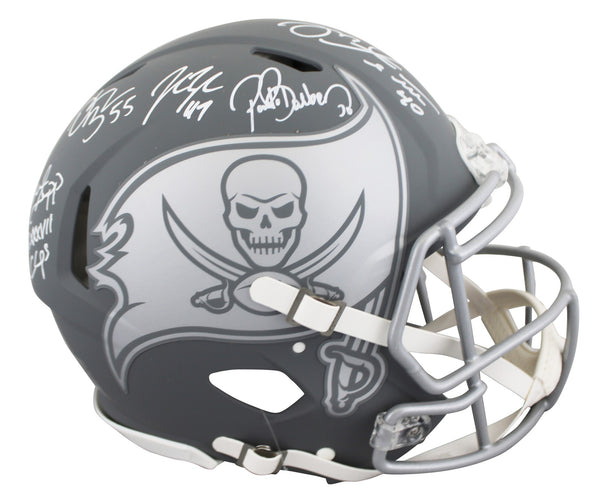 This Autographed Alternate Slate Riddell Authentic Full Size Speed Proline Helmet with the inscription of "SB XXXVII Champs (Sapp)" has been Personally Signed by John Lynch, Ronde Barber, Mike Alstott, Derrick Brooks & Warren Sapp of the Tampa Bay Buccaneers. This item is 100% Authentic to include a hologram by Beckett Authentication Services. This item will come with an affixed Beckett Authentication Services (BAS) authentication sticker, which includes a scannable QR code to verify authenticity. Please note that Beckett no longer provides serial-numbered COA cards, and the attached BAS sticker will serve as the complete authentication for this item. This is a BAS Witnessed Protection Program item which means a Beckett Authentication Service representative was present when this item was being signed. We conducted an autograph signing with John Lynch, Ronde Barber, Mike Alstott, Derrick Brooks & Warren Sapp where multiples of the same item were signed. While the photographs are representative of this item, the size, placement and strength of the signature may vary. Each item is hand signed, therefore, each autograph is unique. This item can be verified through BAS Witnessed.