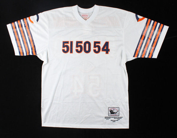 Custom on-field style Monsters of the Midway Chicago Bears jersey. Eveything sewn on, size XL. Hand-signed by 3 Hall of Fame Middle Linebackers: Dick Butkus 1965-1973, Brian Urlacher 2000-2012, & Mike Singletary 1981-1992. The lot / autograph(s) includes an official Beckett hologram for authenticity purposes.Authentication: Beckett Hologram