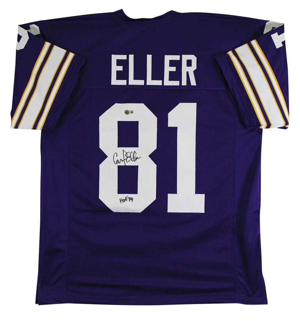 This Autographed Purple Pro Style Jersey with the inscription of "HOF 2004" has been Personally Signed by Carl Eller of the Minnesota Vikings. This item is 100% Authentic to include a hologram by Beckett Authentication Services. This item will come with an affixed Beckett Authentication Services (BAS) authentication sticker, which includes a scannable QR code to verify authenticity. Please note that Beckett no longer provides serial-numbered COA cards, and the attached BAS sticker will serve as the complete authentication for this item. This is a BAS Witnessed Protection Program item which means a Beckett Authentication Service representative was present when this item was being signed. We conducted an autograph signing with Carl Eller where multiples of the same item were signed. While the photographs are representative of this item, the size, placement and strength of the signature may vary. Each item is hand signed, therefore, each autograph is unique. This item can be verified through BAS Witnessed. This is a X-Large sized, non-branded, custom-stitched Jersey.