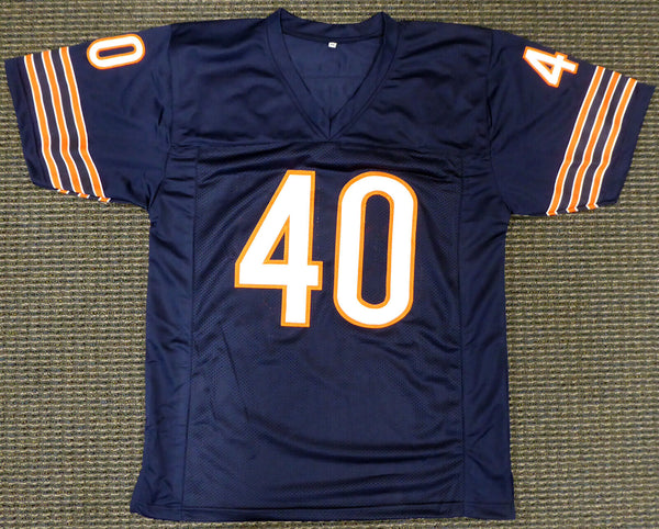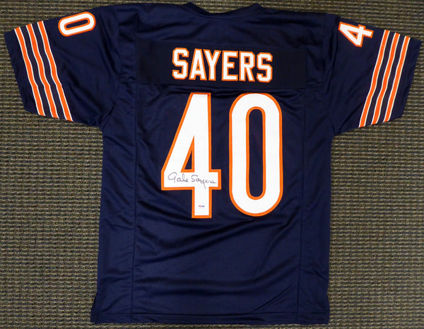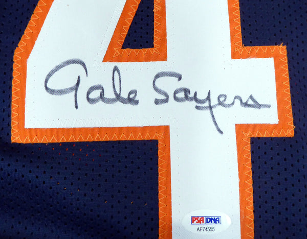 This is a Blue Custom Jersey that has been hand signed by Gale Sayers. This is a custom jersey with no name brand. The approximate size is XL. It has nice sewn in name and numbers. This item has been certified authentic by PSA/DNA and comes with their tamper-proof sticker and matching certificate of authenticity.