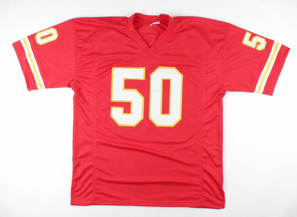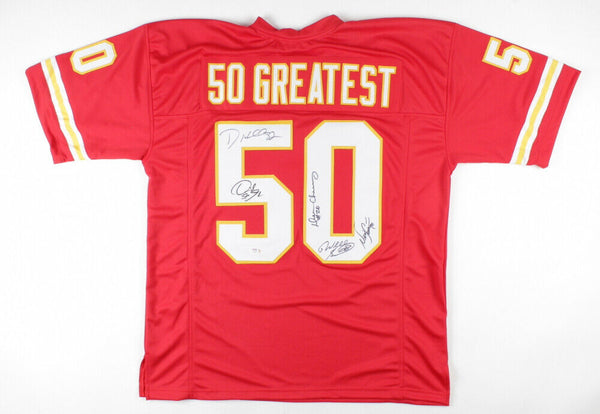 Custom on-field style jersey. Everything is sewn on, size XL. Hand-signed by Neil Smith, Derrick Johnson, Will Shields (HOF), Deron Cherry and Dante Hall.The lot / autograph(s) includes an official PSA/DNA hologram and matching COA for authenticity purposes. The signing of this item was witnessed by PSA.Authentication: PSA COA Check out all the items in our Friendly Confines Collectibles store, Thanks for looking.