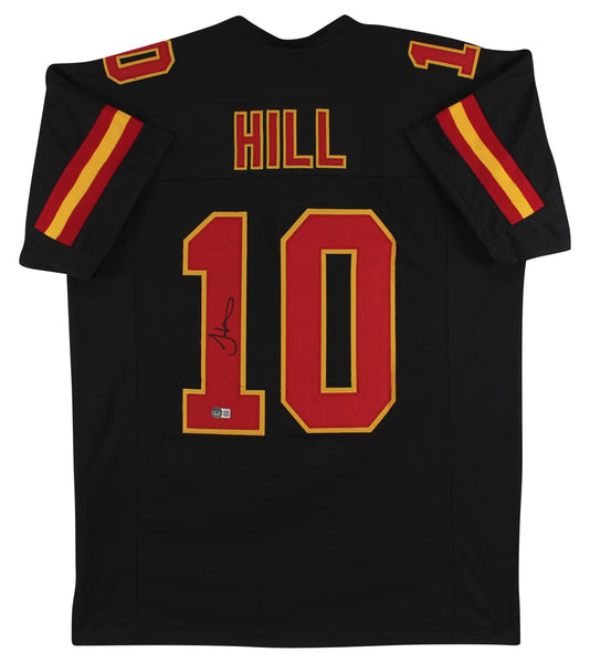 This Autographed Black Pro Style Jersey has been Personally Signed by Tyreek Hill of the Kansas City Chiefs. This item is 100% Authentic to include a hologram by Beckett Authentication Services. This item will come with the new Beckett Authentication hologram that has a scannable QR code rather than the traditional COA. If you would like to have a COA, you are welcome to reach out to Beckett for a printed certification once you receive your item. This is a BAS Witnessed Protection Program item which means a Beckett Authentication Service representative was present when this item was being signed. This is a stock item. We conducted an autograph signing with Tyreek Hill and we have several of these available. The one you will receive will be of equal quality to the one pictured. This item can be verified through BAS Witnessed. This is a X-Large sized, non-branded, custom-stitched Jersey.