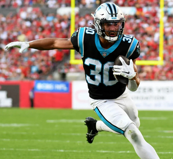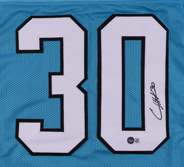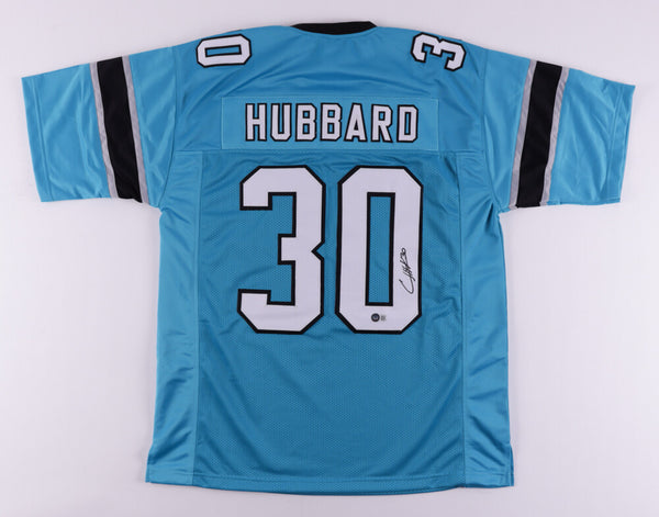 Custom on-field style jersey. Everything is sewn on, size XL. Hand-signed in black felt-tip pen by Chuba Hubbard. The autograph includes an official Beckett Authentication Services serially numbered scannable hologram and QR Code card for authenticity purposes.Authentication: Beckett Scannable Hologram with QR Code Card