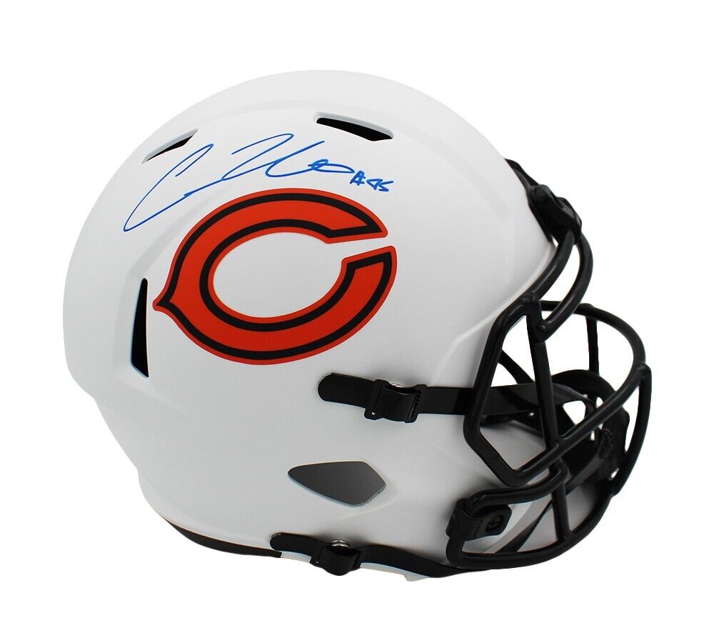 A Chicago Bears Speed Replica Lunar NFL Helmet hand signed by Cole Kmet. The item and signature are in excellent condition. Cole is a football tight end. He played for Notre Dame in college. He now plays for the Chicago Bears after being selected in the 2nd round of the 2020 NFL Draft. AUTHENTICATION: The item is accompanied by a Beckett Serial Numbered and Databased Hologram