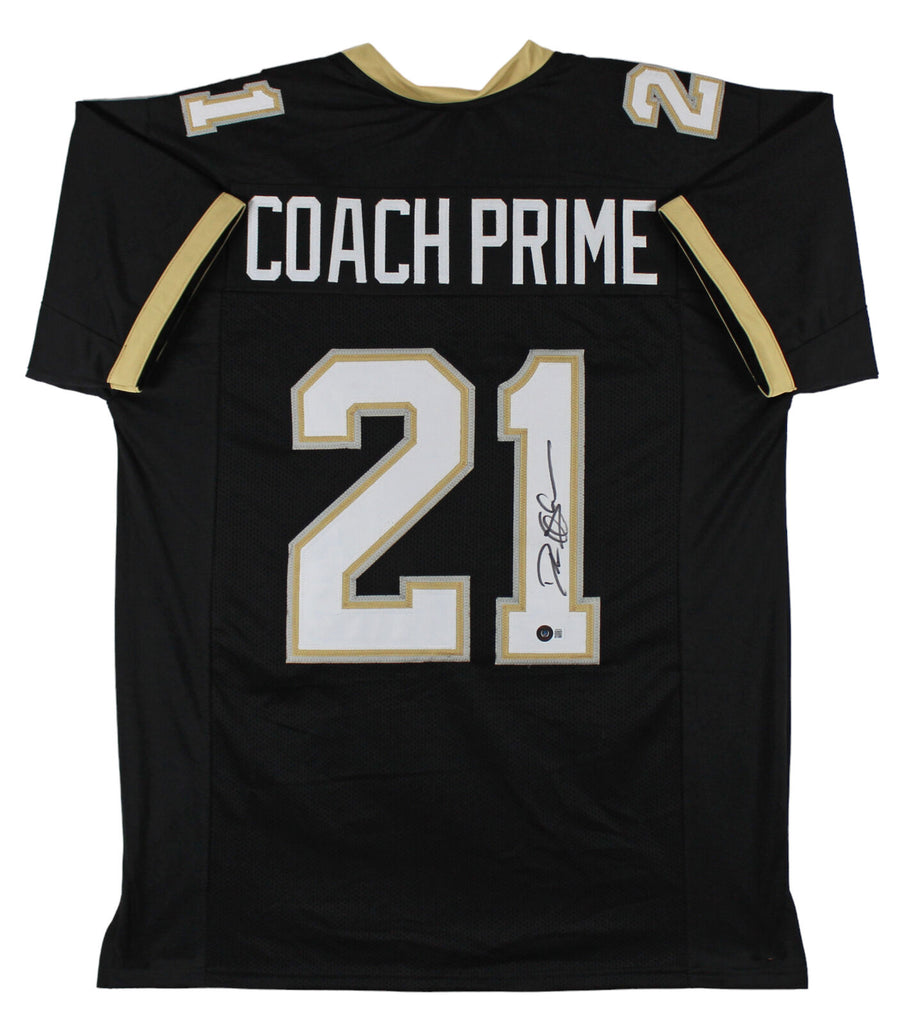 This Autographed Coach Prime Black Pro Style Jersey has been Personally Signed by Deion Sanders of the Colorado Buffaloes. This item is 100% Authentic to include a hologram by Beckett Authentication Services. This item will come with the new Beckett Authentication hologram that has a scannable QR code rather than the traditional COA. If you would like to have a COA, you are welcome to reach out to Beckett for a printed certification once you receive your item. This is a BAS Witnessed Protection Program item which means a Beckett Authentication Service representative was present when this item was being signed. We conducted an autograph signing with Deion Sanders where multiples of the same item were signed. While the photographs are representative of this item, the size, placement and strength of the signature may vary. Each item is hand signed, therefore, each autograph is unique. This item can be verified through BAS Witnessed. This is a X-Large sized, non-branded, custom-stitched Jersey.
