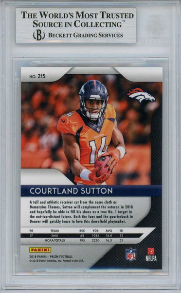 Courtland Sutton Autographed 2018 Panini Prizm #215 Rookie Card BAS Slab 30021 The number in the listing title is just an inventory sku for our records and is not the authentication number. This is a 2018 Panini Prizm #215 rookie trading card that was personally autographed by Courtland Sutton. This was professionally authenticated and slabbed by Beckett Authentication Services (BAS), also includes a certificate of authenticity from Denver Autographs.