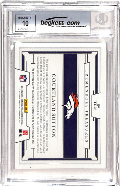 Courtland Sutton Signed 2018 National Treasures Grade 10 Auto BAS 38530 The number in the listing title is just an inventory sku for our records and is not the authentication number. The item pictured is the exact item you will receive so see photos for condition. This is a slabbed 2018 National Treasures Patch TT-26 Trading Card that was personally autographed by Courtland Sutton with a Grade 10 Autograph. Includes a certificate of authenticity from Beckett Authentication Services (BAS) and Denver Autographs.