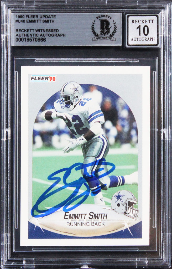 This Autographed Auto Graded Gem Mint 10! 1990 Fleer Update #U40 Rookie Card has been Personally Signed by Emmitt Smith of the Dallas Cowboys. This item is 100% Authentic, it comes slabbed and authenticated by Beckett Authentication Services. We have multiples of this same item. While the photographs are representative of this item, the size and placement of the signature may vary. Each item is hand signed, therefore, each autograph is unique.