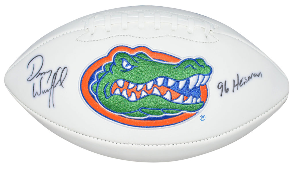 Danny Wuerffel, former Heisman Trophy winning quarterback for the Gators, has hand signed this Florida white panel logo football at a private signing. He included the inscription "96 Heisman". This item comes with a certificate of authenticity (COA) from Beckett Authentication Services and was signed in the presence of one of their representatives. You will receive a serial-numbered COA along with a matching serial-numbered sticker on the ball. The authenticity can be verified online by entering the serial number.Item pictured may not be the exact item you will receive. It will be similar quality, and we guarantee your satisfaction.