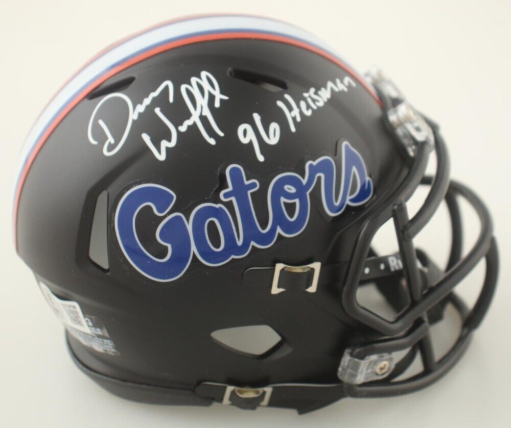 Riddell Florida Gators Speed mini helmet. Hand-signed and inscribed by Danny Wuerffel (HOF).The autograph includes an official Beckett Authentication Services serially numbered hologram and QR Code card for authenticity purposes. The signing of this item was witnessed by Beckett.Authentication: Beckett QR Code card