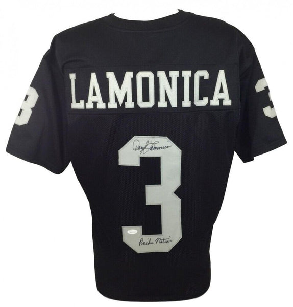 Custom on-field style jersey with everything sewn on, size XL. Hand-signed in black felt-tip pen by Daryle Lamonica.It was in Oakland that Lamonica's passing acumen earned him the nickname "the Mad Bomber", though his accuracy was sometimes suspect, as indicated by the fact that as a Raider starter from 1967 to 1972, his best completion average was only 53.0% (in 1972), though it may be argued that was because his passes were so very long.The lot / autograph(s) includes an official James Spence Authentication (JSA) hologram and matching COA for authenticity purposes. The signing of this item was witnessed by JSA.Authentication: JSA COA