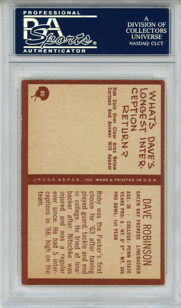 Dave Robinson Signed 1967 Philadelphia #80 Trading Card HOF PSA Slab 42669 The number in the listing title is just an inventory sku for our records and is not the authentication number. This is the exact item that you will receive so please see pictures for condition. This is a trading card that was personally autographed by Dave Robinson. This has been professionally slabbed by Professional Sports Authentication (PSA) and includes a certificate of authenticity from Denver Autographs.