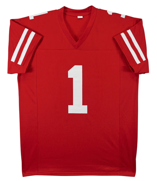 This Autographed Red Pro Style Jersey has been Personally Signed by Deebo Samuel of the San Francisco 49ers. This item is 100% Authentic to include a Certificate of Authenticity (COA) / hologram by JSA. We have multiples of this same item. While the photographs are representative of this item, the size, placement and strength of the signature may vary. Each item is hand signed, therefore, each autograph is unique. This is a X-Large sized, non-branded, custom-stitched Jersey. There is some staining / color transfer along with some dirt transfers on these jerseys. Please refer to photos prior to purchase.