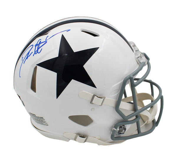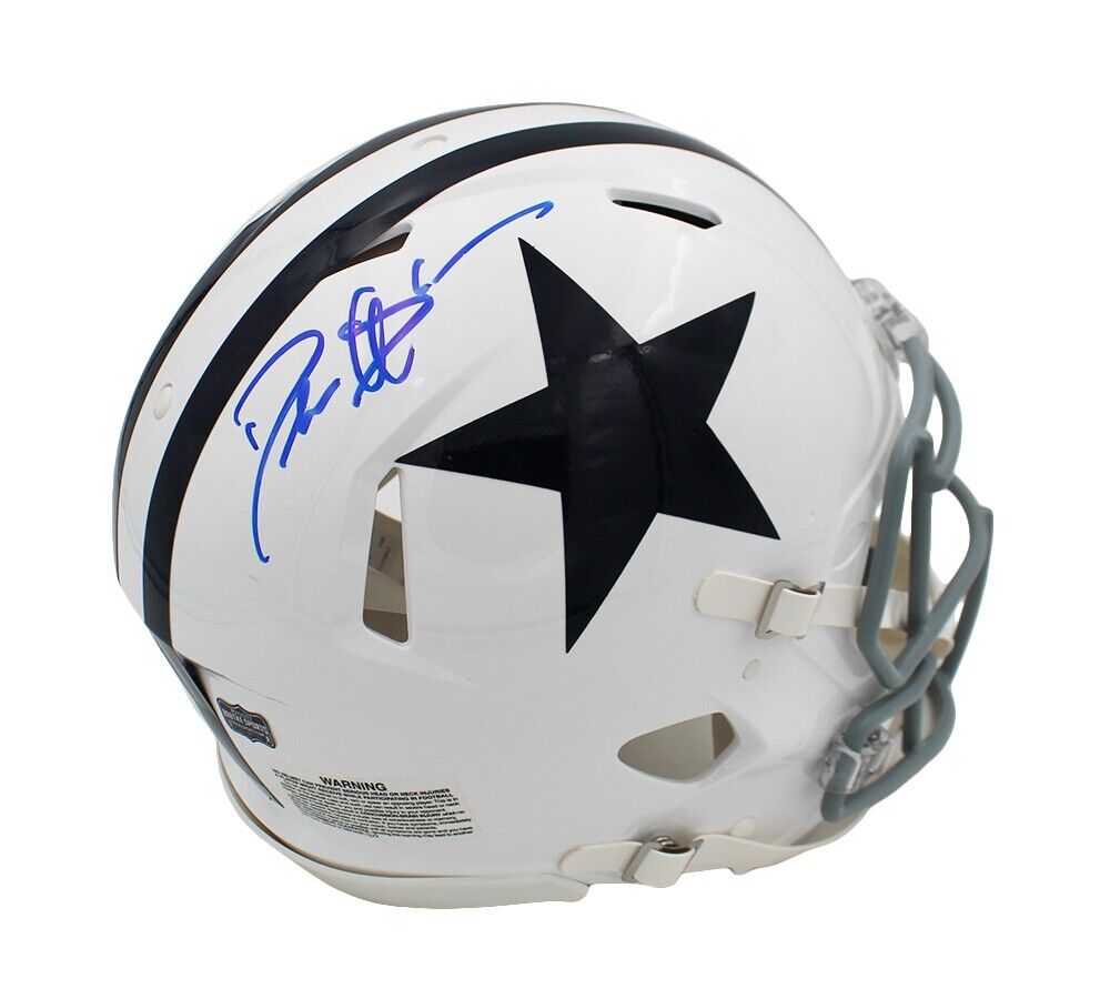 A Dallas Cowboys Speed Authentic Throwback 1960-63 NFL Helmet hand signed by Deion Sanders. The item and signature are in excellent condition. Deion is a 2x Super Bowl Champion, 8x Pro Bowler, in the Atlanta Falcons Ring of Honor and dominated two sports during his career. AUTHENTICATION: Your item has been tagged with a SmarTag powered by Prova Technology, which gives you digital access to your items authentication records, including a proof picture from the signing.